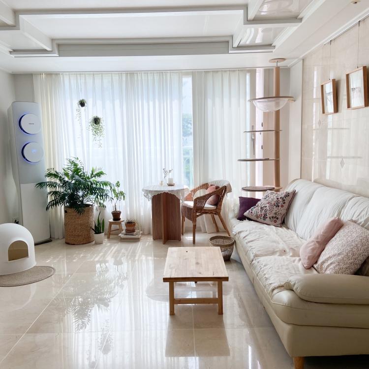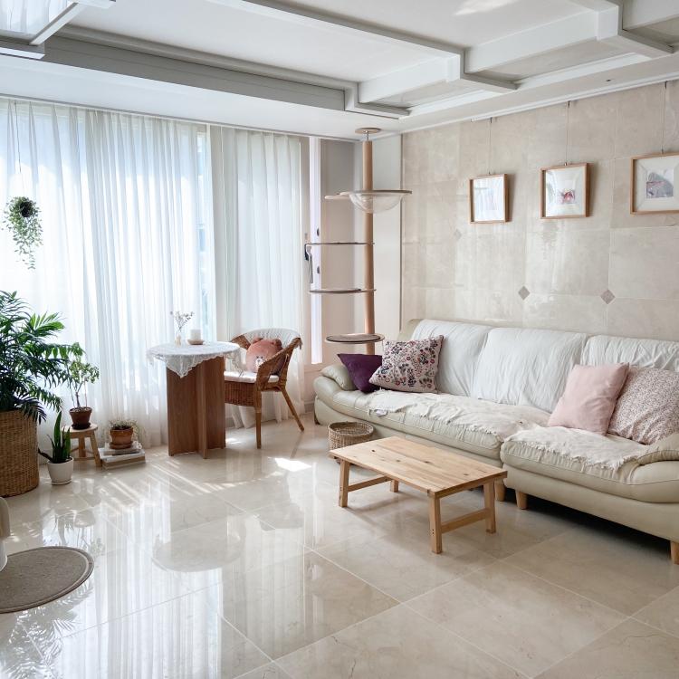 아이보리색에 원목이 어우러진 저희집 거실이랍니다.