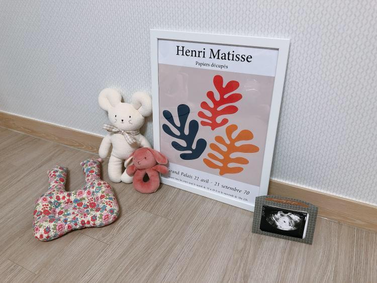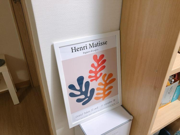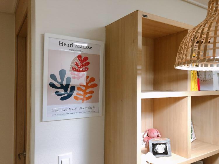 아이방 꾸민다고 액자들여놨어요! 애착인형이랑 같이 두니 귀엽네요! 앙리마티스 종이오리기 중 하나 골랐는데 아이방인테리어에 딱 좋은 것 같아요! 집에 원래 있던 우드책장이랑 우드라탄조명등이랑도 잘 어울려요 :)