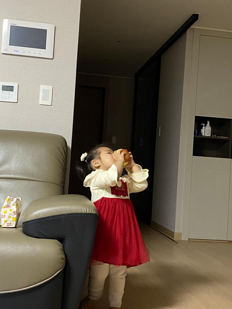 어린이집 시장놀이에서 사온 사과를 야무지게 먹고 있어요