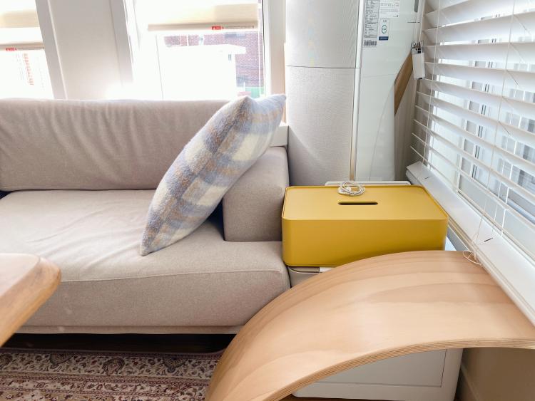 쿠션커버를 교체했더니 노랑수납이랑도 원목이랑도 쇼파랑도 너무 잘 어울려 기분 좋아지는 공간이됬어요^^