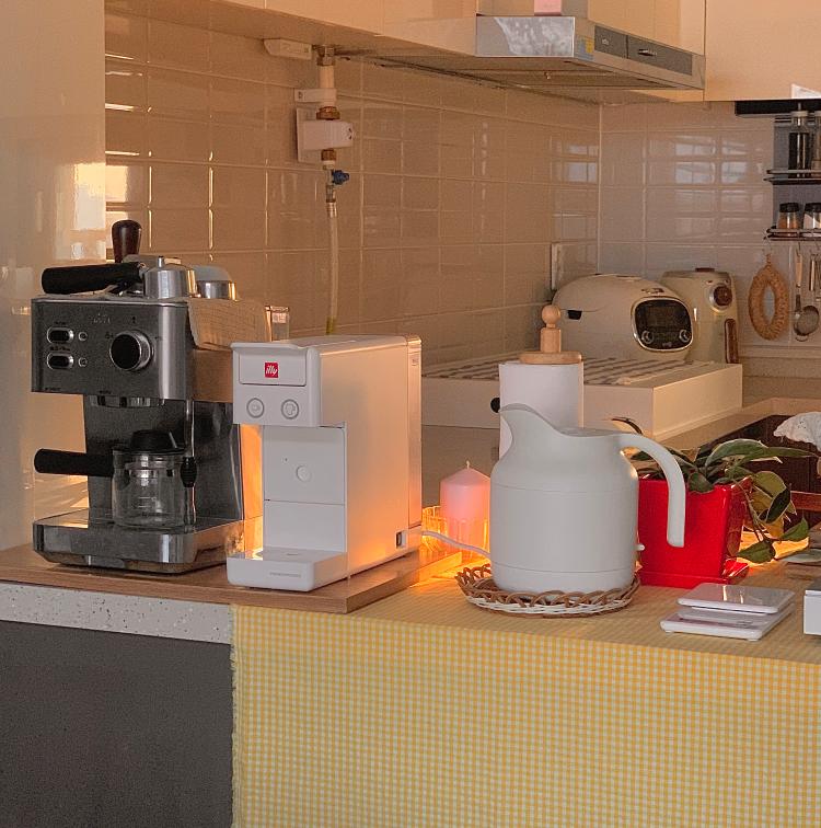 주방 한 켠의 모습- 햇살 들어오는 모습이 예뻐서 찰칵! 소형 가전들을 아일랜드에 놓고 쓰고있는데 편리해요. 🥰