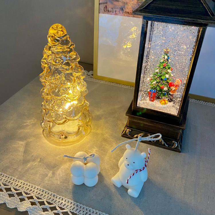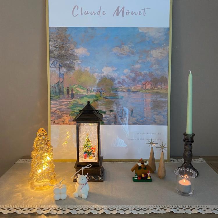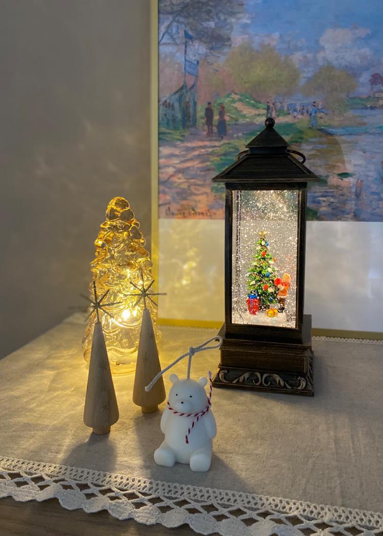 크리스마스가 다가와서 서랍장 위를 꾸며보았어요✨ 작은 소품들이랑 워터볼, 조명을 올렸어요😶 조금은 복잡해보이나요?