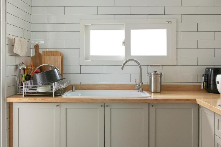 따듯한 분위기의 원목주방이에요:) 상부장을 달지 않아 넓게 보이게 했어요.