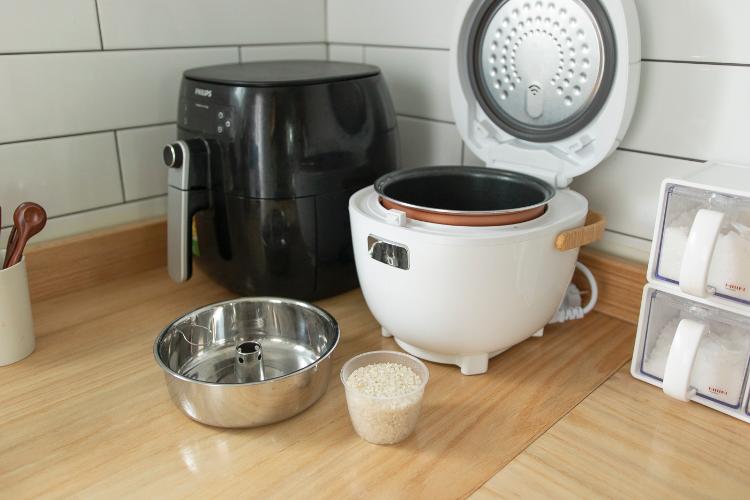 건강을 생각해서 저당밥솥 쓰고 있어요. 저 스테인리스를 밥통 위에 올려놓고 뚜껑을 닫아요. 밥을 다 짓고 나면 탄수화물 물이 스테인리스 통으로 올라와요.