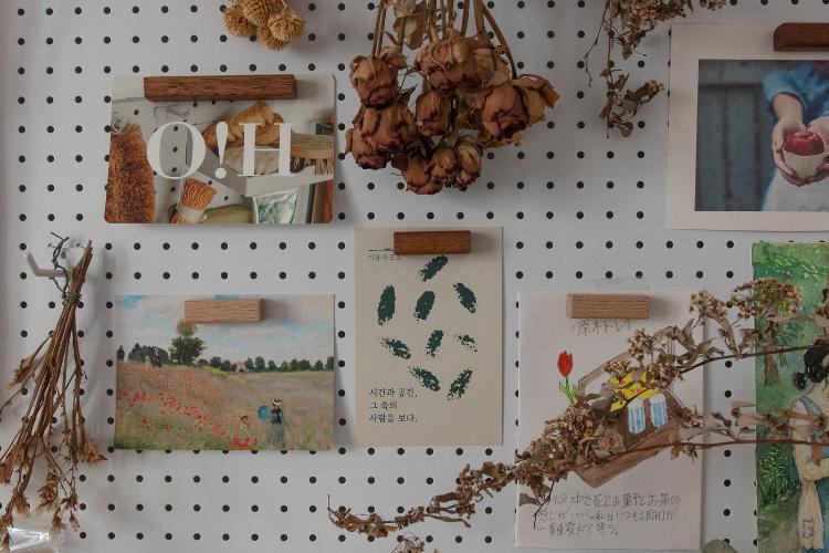 타공판에 선물받은 엽서와 그림들 붙여두고 보고있어요.^^