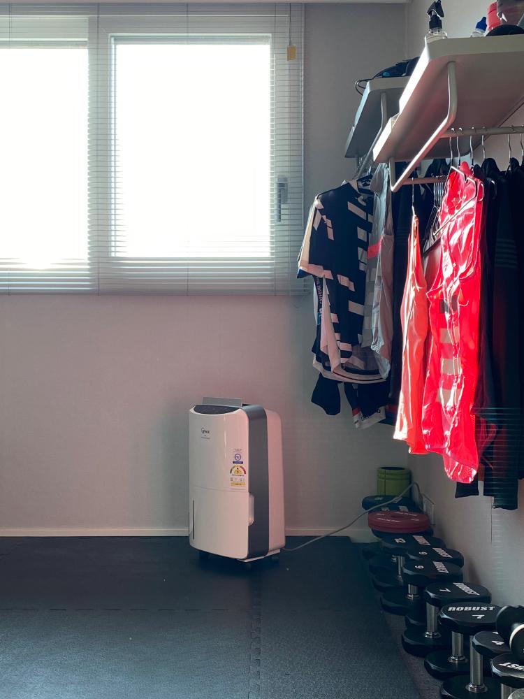 방 하나를 홈짐으로 만들기 위해 준비중이에요. 헬스머신이 들어오기 전부터 방에 제습기를 설치해뒀네요 ㅎㅎ