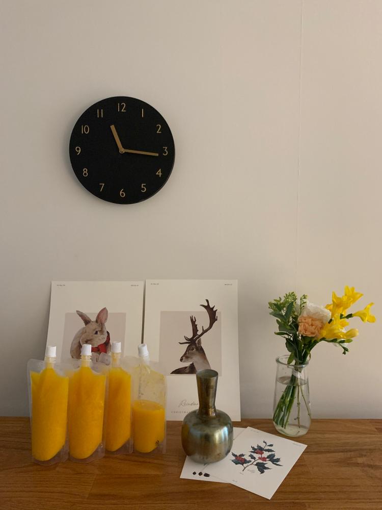 흰 벽에 검정 시계 하나가 미니멀한 감성을 주는 것 같아요. 신혼집 음 꾸밀 때 산건데 벌써 6년 넘게 쓰고 있네요:)