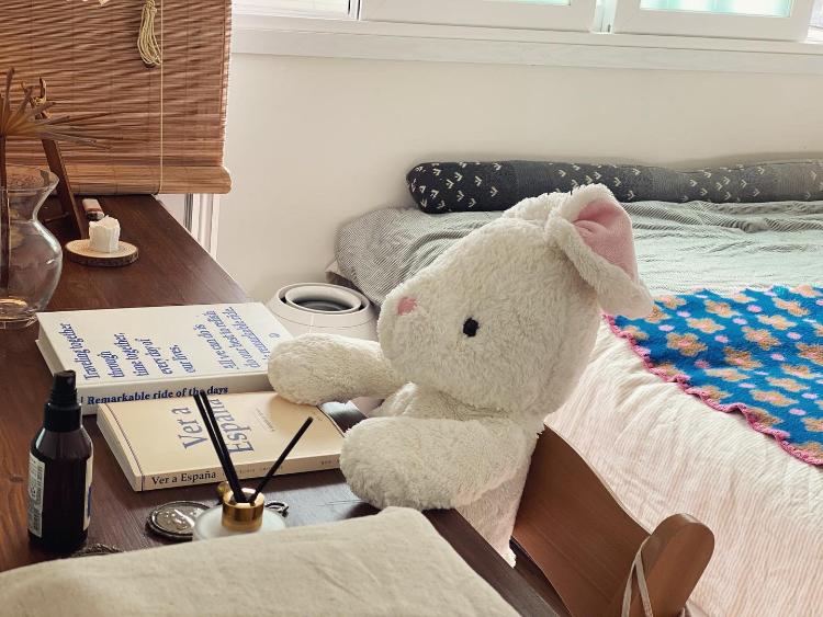 이불 정리 하려고 인형을 의자에 앉혀놨는데 귀염뽀짝