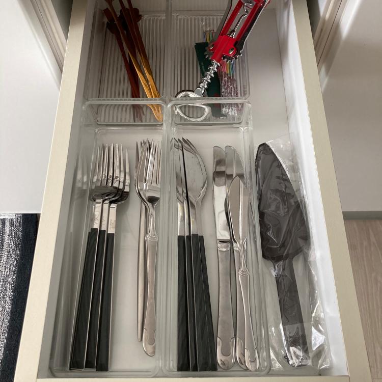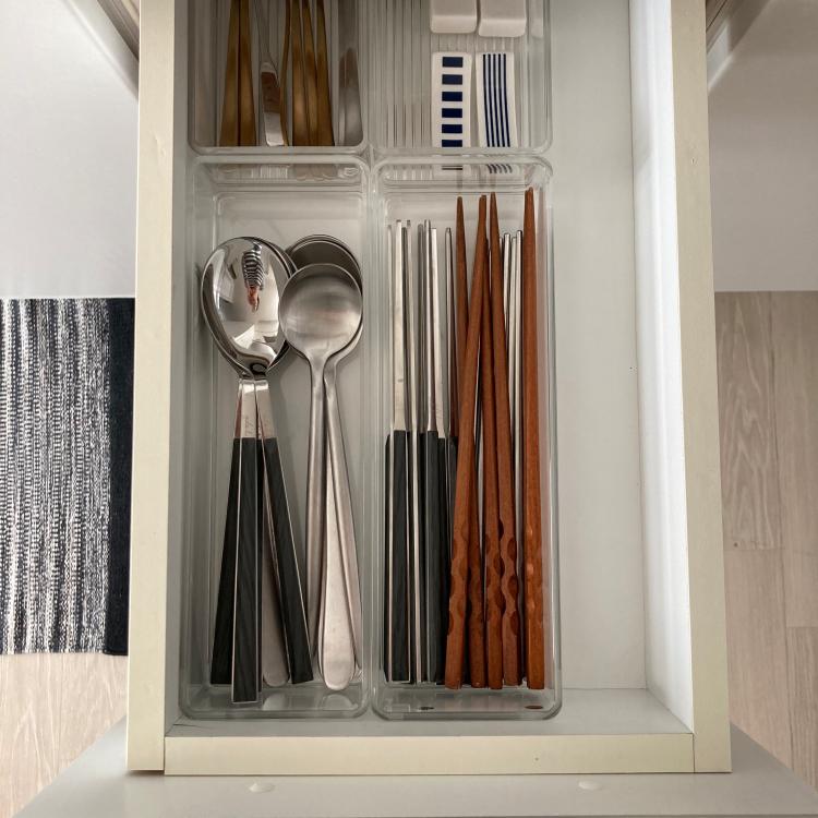 기존에 사용하던 식기도구트레이 사이즈가 맞지 않아서 찾아보던 중에 구매한 아크릴 수납함이에요 -:)