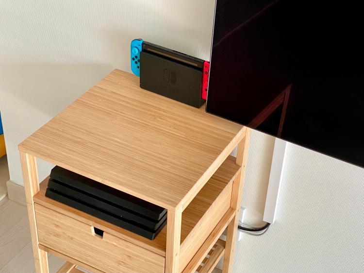 한칸 짜리 서랍은 게임팩과 조이스틱 등 게임기 액세서리를 보관하고 있어요. 겉으로 드러나지 않기 때문에 깔끔할 수 있었습니다.