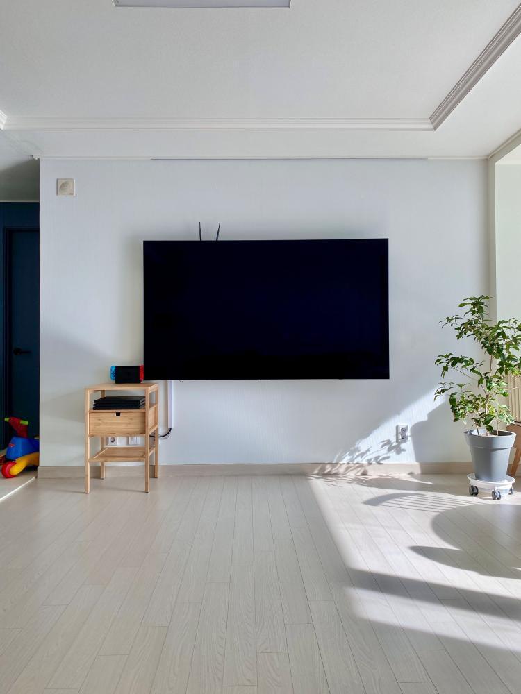 77인치 벽걸이티비에 맞춘 티비장을 하게 되면 너무 커질 것 같아서 게임기만 수납할 수 있을 협탁만 뒀어요. 셋톱박스와 무선인터넷 라우터는 초강력 양면테이프를 이용해 티비 뒷면에 붙였습니다.