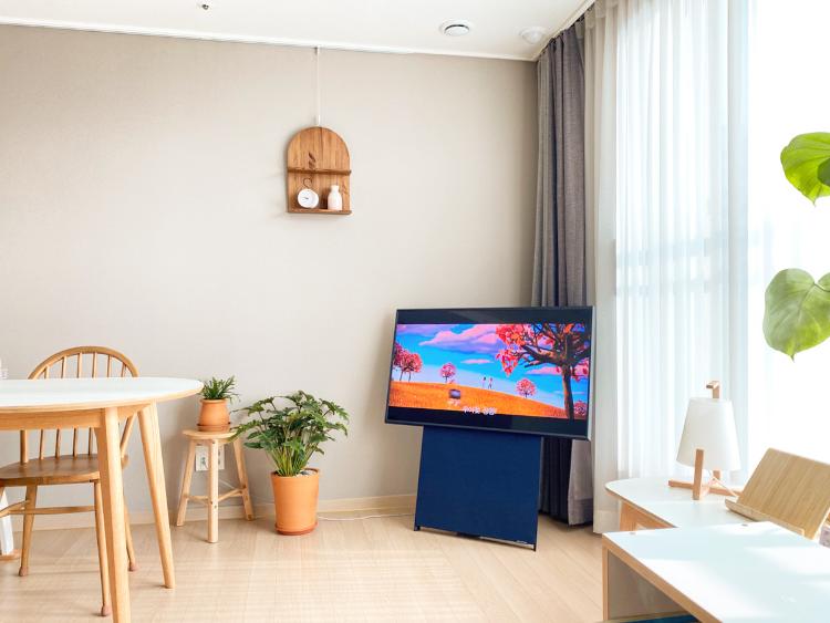 거실에 활용도 많은 원형테이블을 두어 브런치도 즐기고 아이와 책도 보는 다용도 공간입니다. 한쪽에는 책장을, 반대편엔 tv를 두어 생활하고 있습니다. 주말마다 작은 홈시네마가 돌아갑니다:)