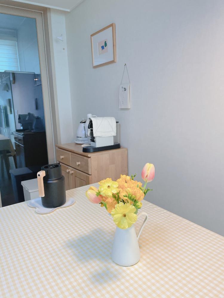노랑 식탁보와 노랑 꽃이 함께한 봄의 식탁이에요:-)