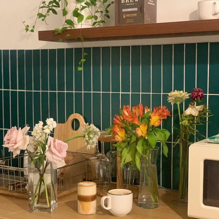 화병 물 갈아주려고 한곳에 모아두니 더 이쁘네요! 딥그린 컬러 타일과 함께하니 더 분위기있는 홈카페 탄생이에요. ☺️