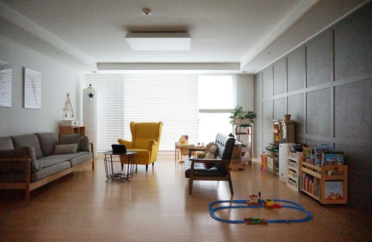 반대편 아이 장난감을 제외하면 깔끔한 거실이에요.