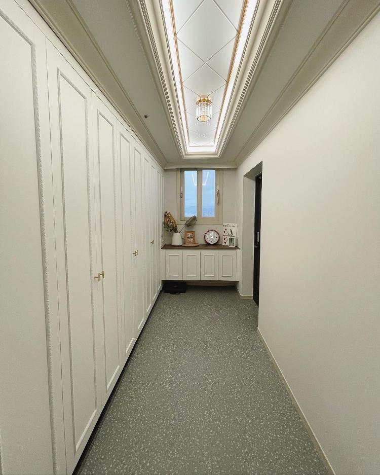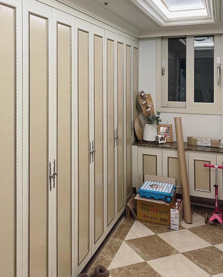 셀프로 바꾼 저희집.현관이에요! 시트지리폼으로 신발장을.화이트로 바꿨어요! 중문은.우드.시트지로 바꿨답니다! 바닥도 테라조 데코타일로 바꿨어요!!.첫도전.이만하면.성공한 거 같아요
