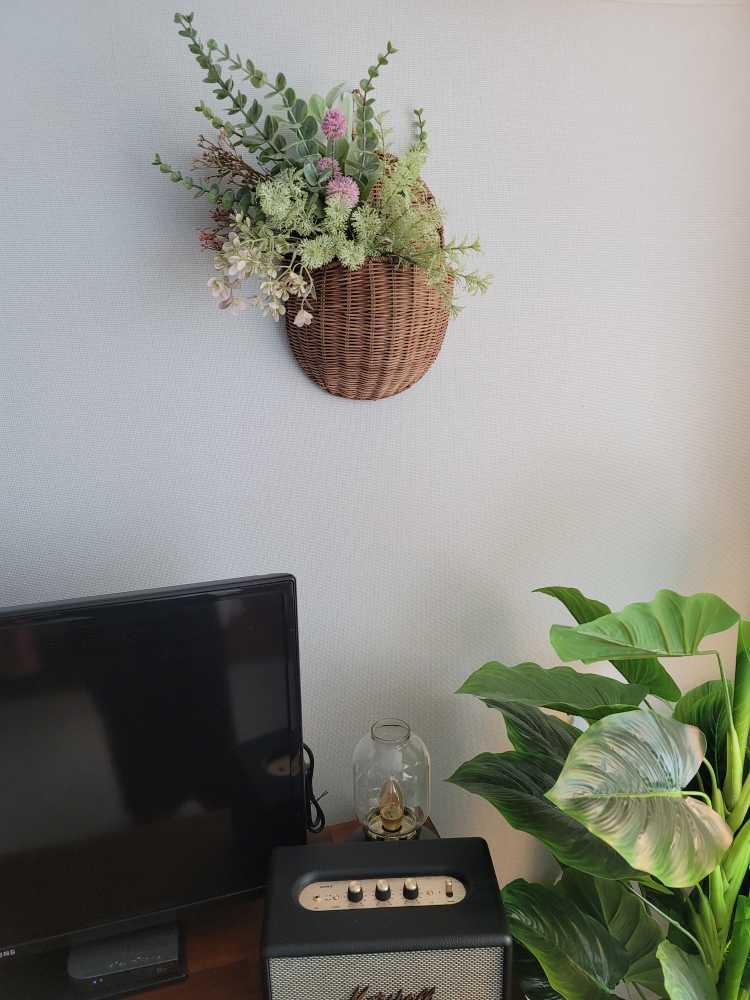 침실 벽에 라탄 바구니와 조화로 화사함을 줬어요~