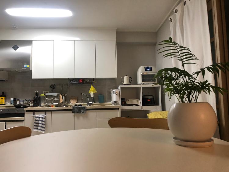소파에 앉아서 복잡한 주방을 바라보며 심란