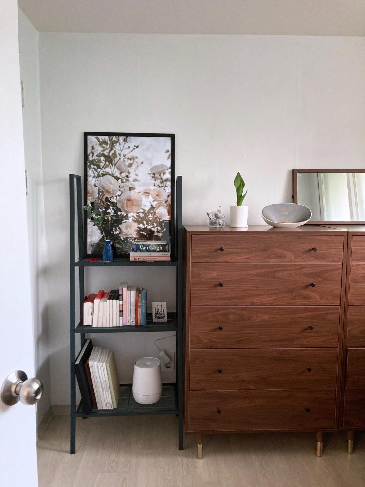 서랍장 위에는 좁아보이는 방을 조금 넓게 보이려고 거울을 눕혀서 배치했습니다.
