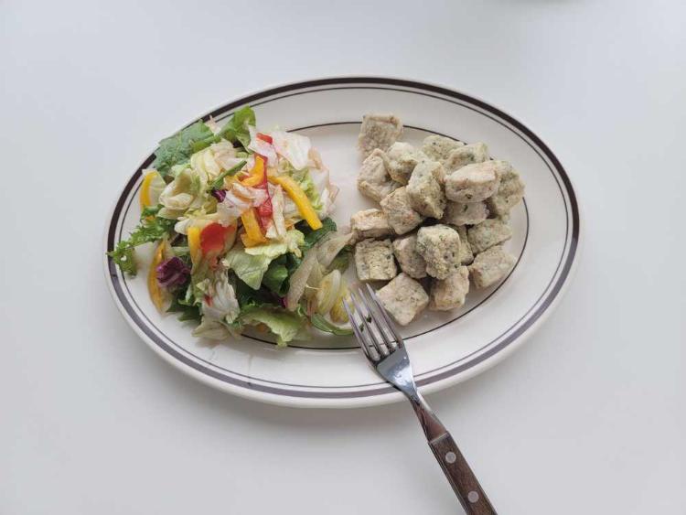 빈티지한 접시에 담은 샐러드와 닭가슴살 큐브