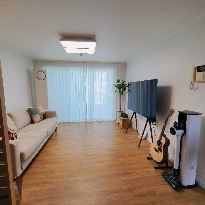 차르르 쉬폰커튼과 베이지톤의 소파와 마치 원래 세트로 맞춘듯 잘 어우러져요.