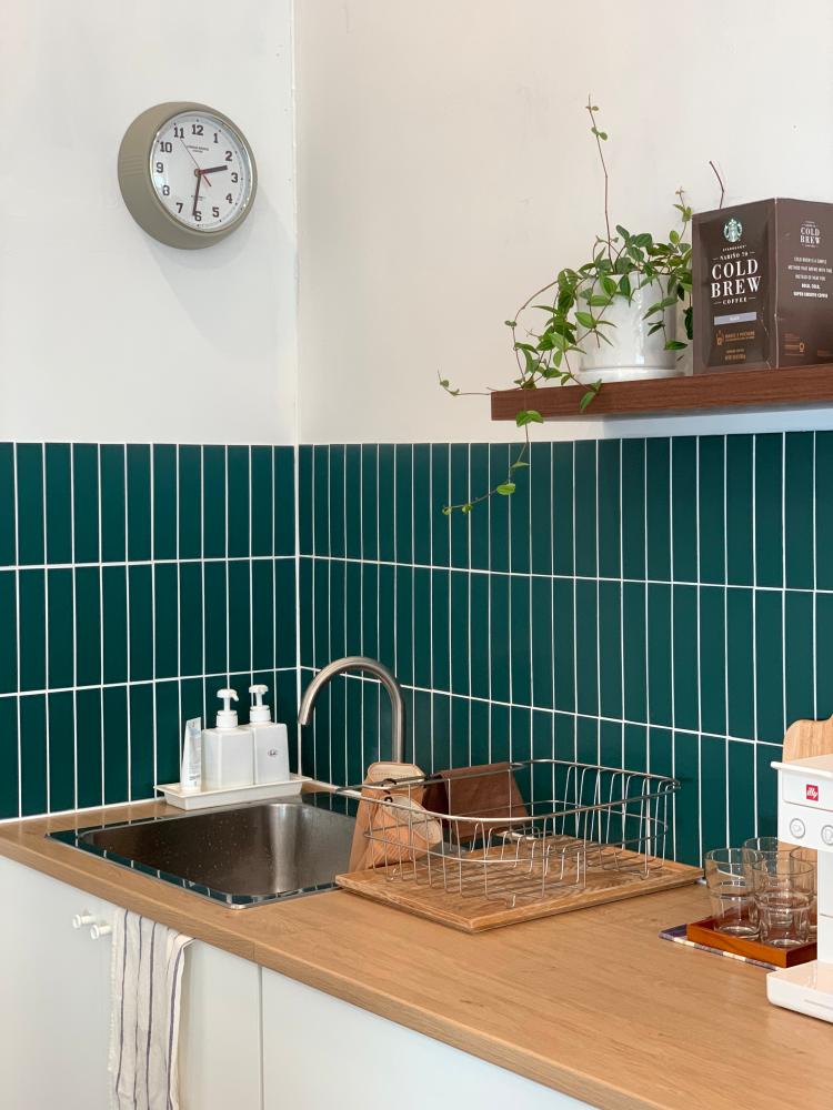 직접 시공한 딥그린 컬러의 주방 타일이에요! 볼수록 예쁘고 마음에 들어요~😊