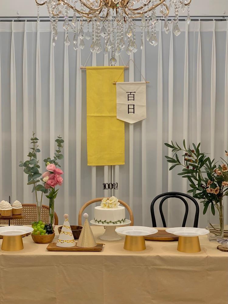 셀프로 꾸민 100일 컨셉 상이에요! 노란색 린넨 패브릭이 마음에 들어요💛