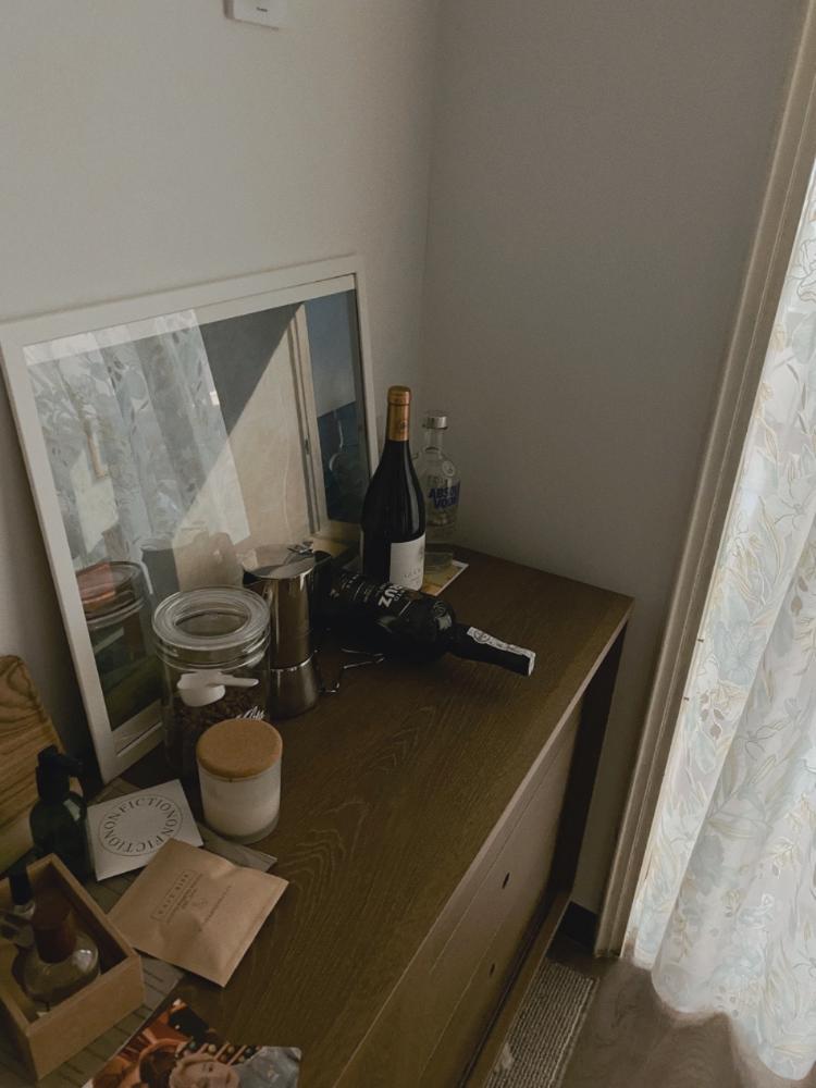 어제 사라진 와인^^ 과 개봉한 앤트러사이트 원두. 빈티지 패브릭으로 쓰고 있는 커튼.