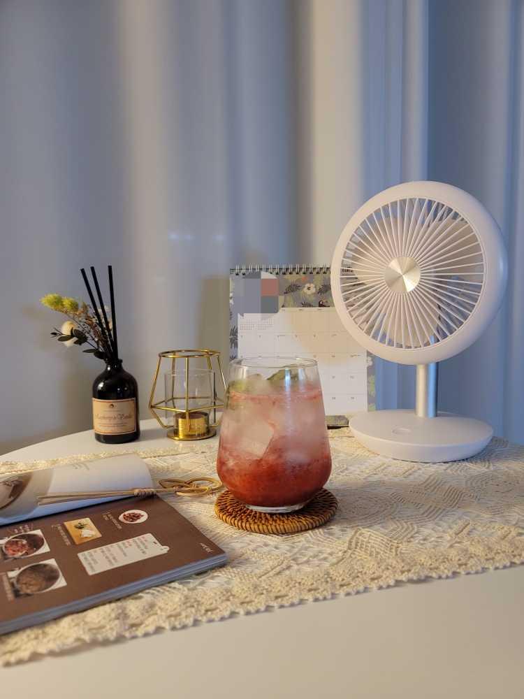 선풍기 바람 쐬며 마시는 딸기에이드~