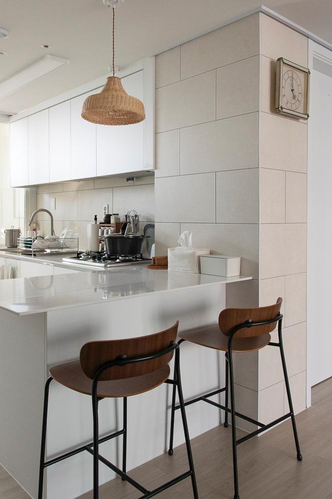 새로 리모델링 한 부모님집 주방이에요. 타일도 예쁘고 아일랜드 식탁 의자도 예쁘고 맘에 듭니다:)