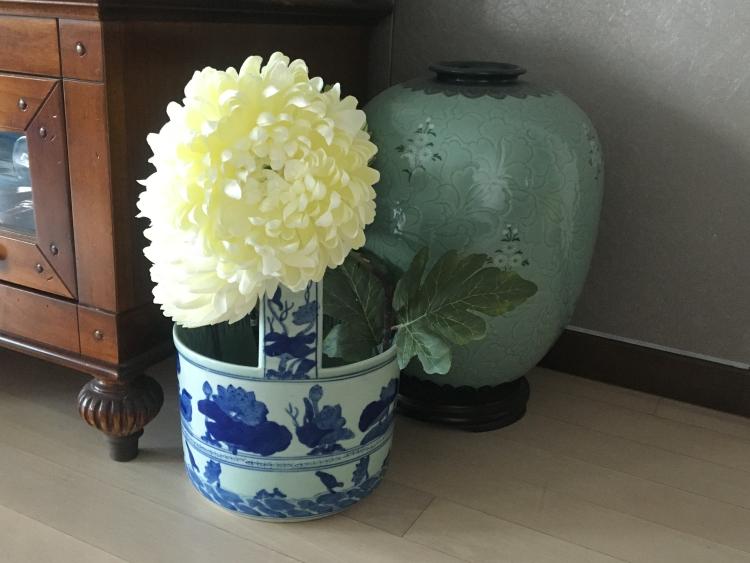 거실 코너에 있는 수국꽃 도자기
