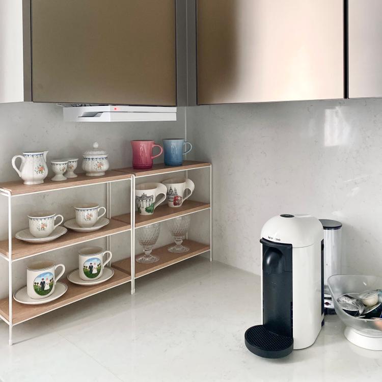 자주쓰는 컵들만 원목선반에 꺼내두고 사용 중이에요! 네스프레소 버츄오로 1일1커피☕️
