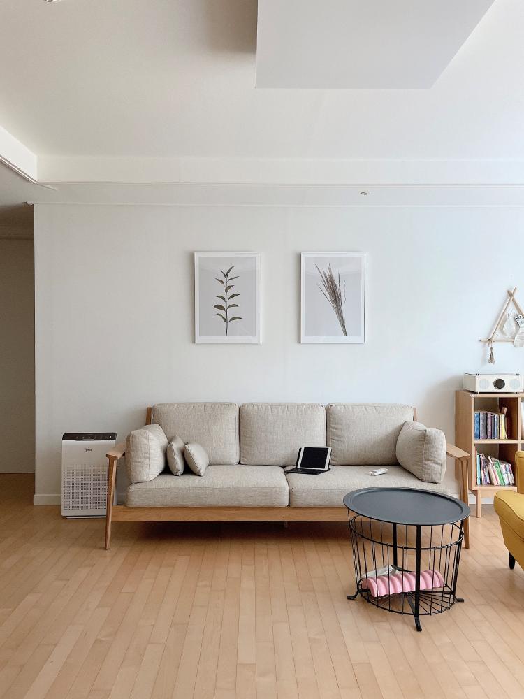 커버 교체가 가능한 원목쇼파예요. 그레이에서 밝은 오트밀 컬러로 바꿔주었더니 한결 가볍고 시원해보여요^^