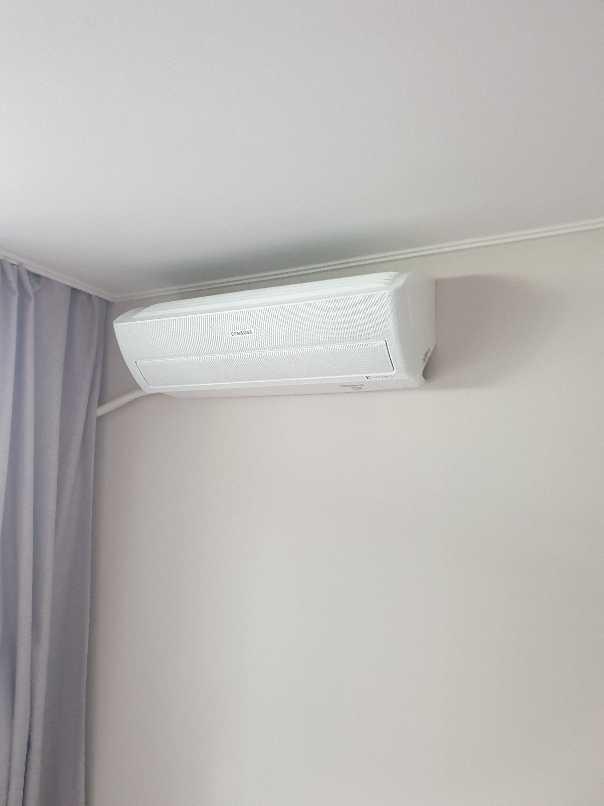 침실에 있는 벽걸이 에어컨이에요