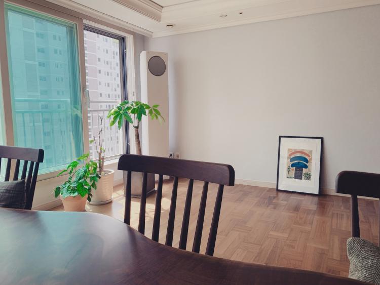 커튼이 깨끗해지고 있는동안 테이블에 앉아서 여유롭게 보내고 있어요. 거실에 들어오는 햇살이 참 따뜻하네요!