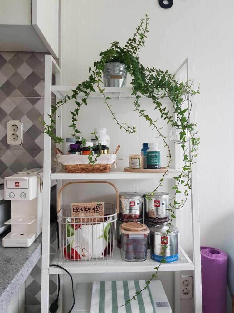 거실 한쪽에 있는 선반 인테리어되고 좋음