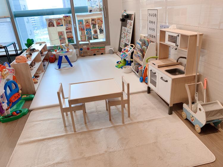식탁과 아기 놀이공간을 나누려고 가운데에 교구장을 두었습니다