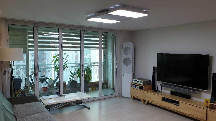 폴딩도어를 열면 거실이 넓어져요. 깔끔하게 정돈된 33평 아파트 거실이에요.