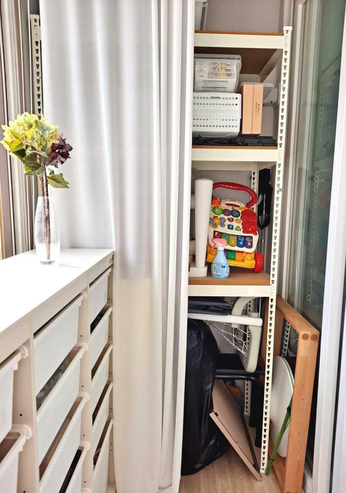 화이트수납장은 자잘한 물건을 넣어두고 , 랙선반에는 부피가 큰 물건을 넣어두어요