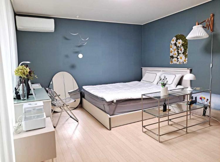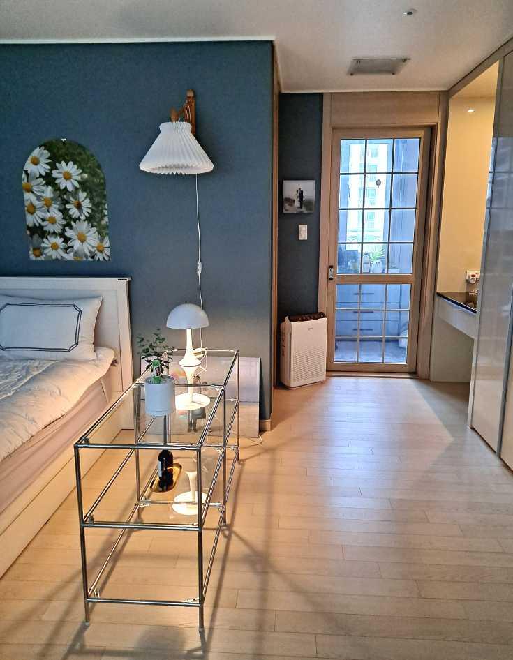 진한 그린벽지와 모듈가구로 꾸민 침실이에요