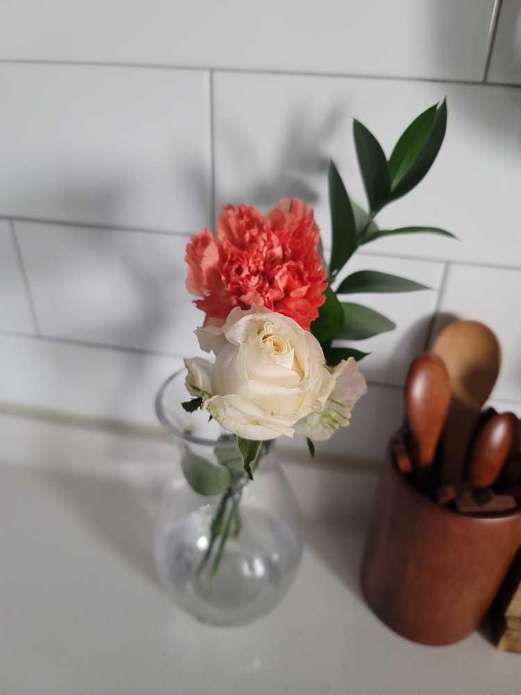 오렌지빛 카네이션과 피치장미로 화사해진 주방이에요^^