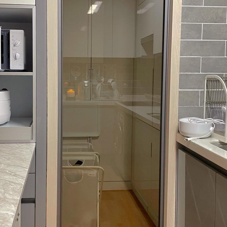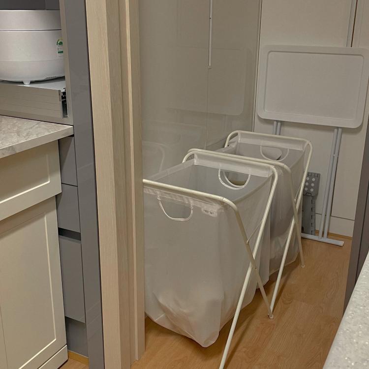 다용도실에 세탁물을 두는 바구니를 따로 두고 있어요. 유리문으로 분리가 되어서 편리해요 :)