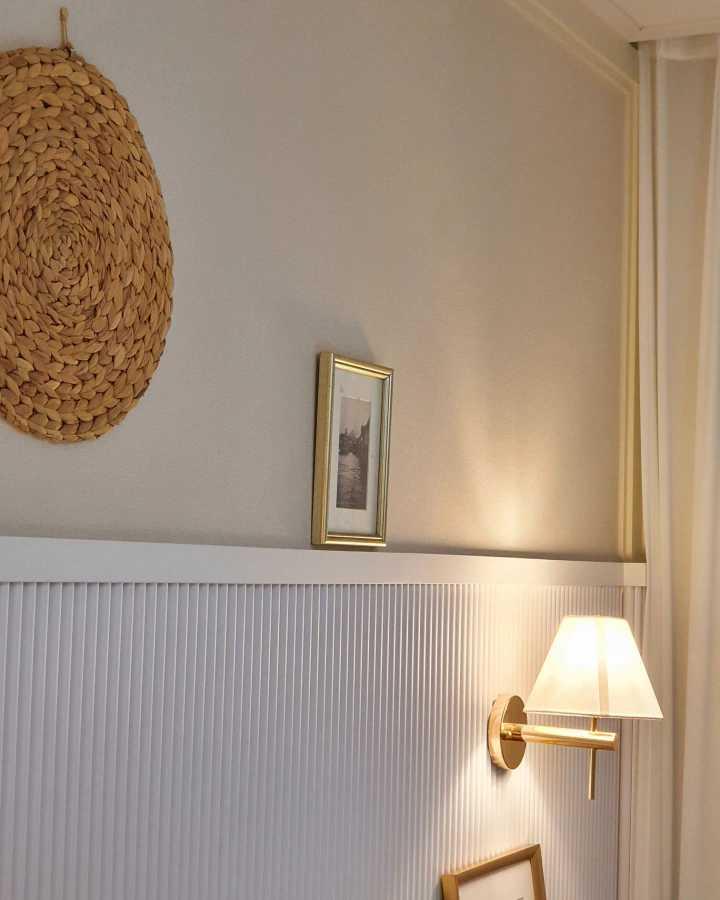 침대헤드쪽 벽에 작은 액자와 라탄매트를 달아서 분위기를 따뜻하게 해보았어요^^