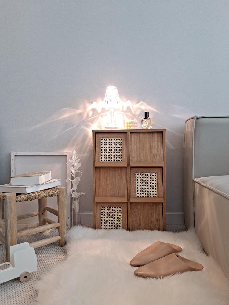 미니 라탄 수납장과 투명해서 빛 퍼짐이 예쁜 조명도 너무 애정하는 아이템이에요🙂