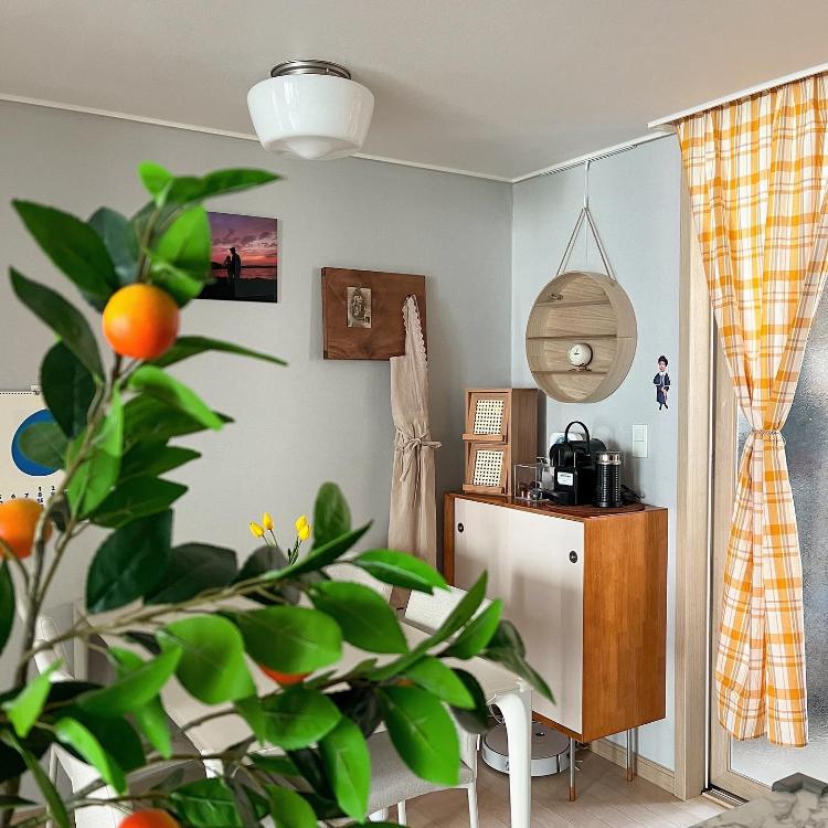 노랑체크커튼으로 싱그러운 느낌의 주방이에요