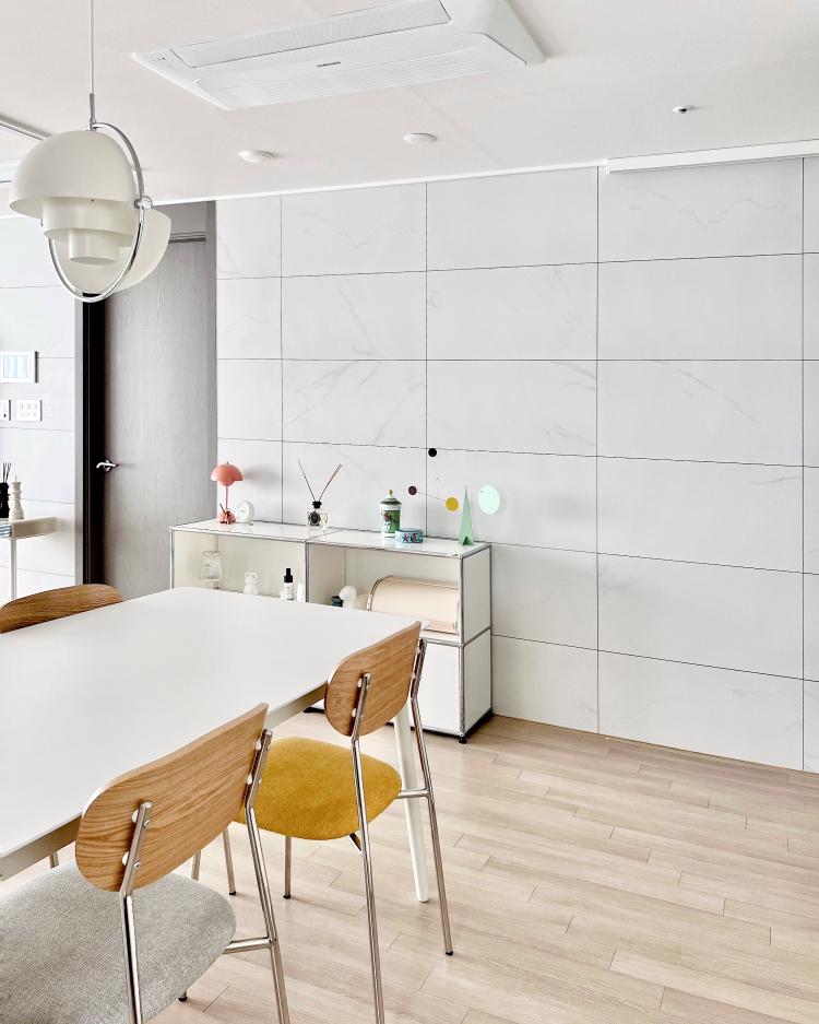 깔끔한 화이트 주방 ◡̈ 식탁 앞에는 usm 모듈가구가 있어요🤍