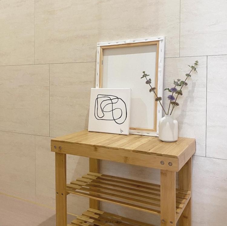 복도에 원목 선반을 두고 소품을.올려두었어요! 여름엔.간소화하는게.인테리어팁같아요🤍 가벼운 여름인테리어로 더위안녕🤍