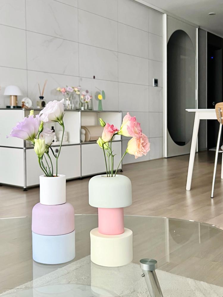 파스텔톤 모듈 꽃병에 비슷한 컬러감의 꽃으로 꽃꽂이🌷🌿💗