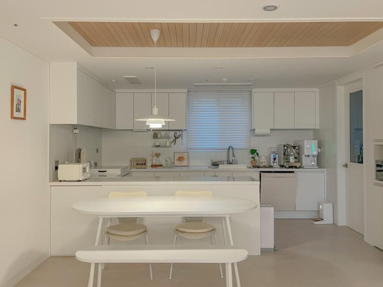 후회없는 화이트 주방이에요 :-) 상부장은 일부러 살려놨는데 수납공간이 넉넉해서 항상 깨끗하게 유지할 수 있어요!
