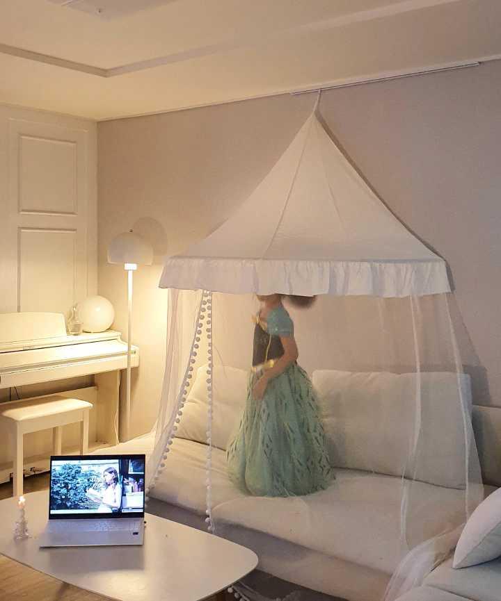 평화로운 거실 모습ㅋㅋㅋ 초1인데 아직 공주님 드레스 좋아하고요. 침대 위에 달아주는 캐노피인데 거실에 달아봤더니 좋아합니다ㅋㅋ